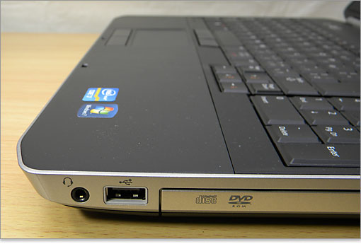 Latitude E5520の側面に装備するインターフェースを紹介します。USB 2.0を計4と装備し、うちひとつがeSATA端子と共用になっています。USB 2.0端子は、左・右・背面の3面に分散しており、使用環境によって不便さを感じることはなさそうです。