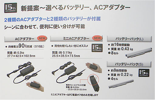 設計だけでなく、モバイルユーザーのニーズに耳を傾けている姿勢も感じられます。例えば、「二種類のACアダプタと、二種類のバッテリー」が付属していることなど。