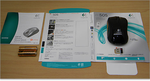 まず開封してみました。m505の梱包内容は、「m505本体、Unifyingレシーバ、取扱説明書、GP製アルカリ電池」です。カスタマイズ用のソフトウエアはWebよりダウンロードするスタイルです。