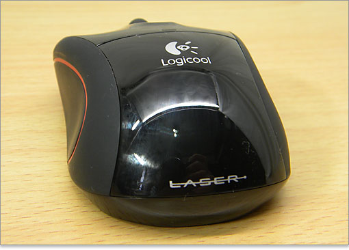 背面。電池カバーの部位になります。Logicoolおよび、LASERのロゴ入り。背面から見ると、エルゴノミクスデザインがよく分かります。