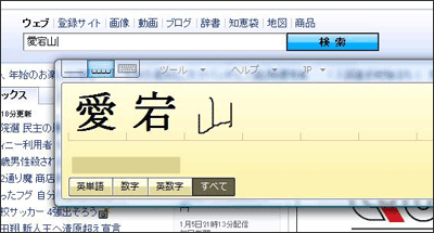 ▲読めない漢字でWeb検索したかったら、手書き入力でテキスト入力できます。マウスで描いたフニャフニャ文字は、認識されると綺麗に書き直されます。