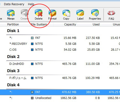 元々OEMパーティションだったパーティションを選択し、「Delete」のボタンをクリック。