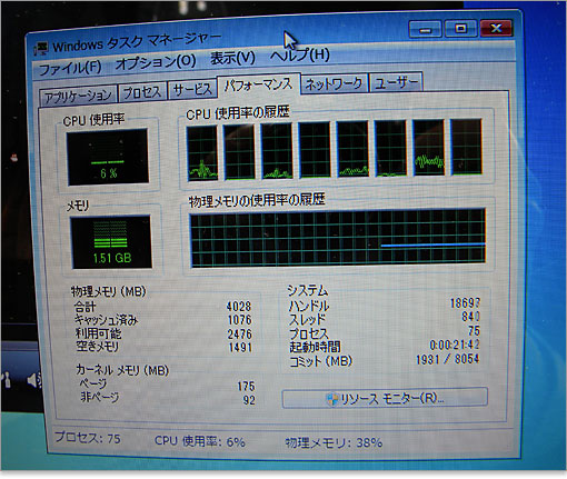 上記構成のノートパソコンでは、CPU使用率はたった6~8%程度。使用メモリは1.5GBほどです。4スレッド動作で動いています。
