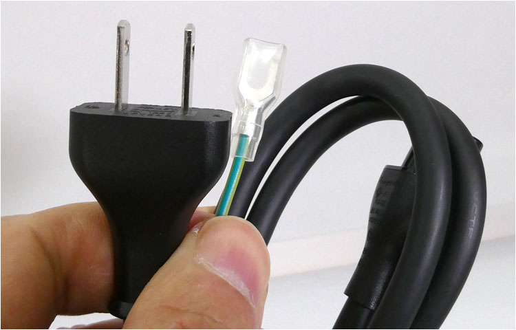 市販されているサプライメーカーの細いケーブル。長さも自分のニーズで合わせられる。アース線が取り除かれた、3ピン(コネクタ形状3ピン)→2ピン変換(電気コンセント側)のタイプである。