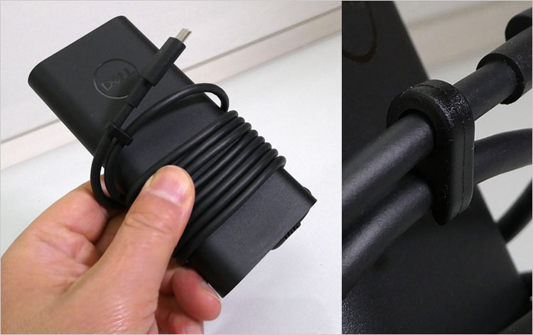 長さは大雑把に測って90cmくらい、重量101gだった。直径7mmなので太くてがっちりしたケーブルである。しかも形状記憶しているかの如く硬く、取り回しが悪い。DELLはグローバルPCメーカーなので、日本寄りではなく電源事情の悪い海外に合わせているのだろう。もうひとつはユーザーの酷い扱いによる破損(断線)のリスク回避と思われる。