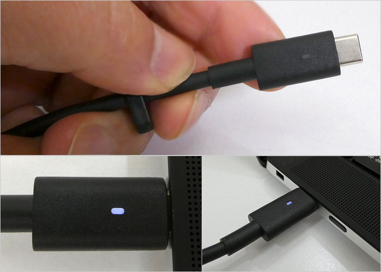 PCに接続するUSB Type-Cコネクタ。白く点灯する通電LEDライトが付いている。USB Type-Cコネクタは裏表関係なくどちら側も挿入できるので、通電LEDライトも両面に付いている。