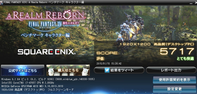 ファイナルファンタジーXIV 新生エオルゼアでも、「1920 × 1080フルスクリーンモード、高品質デスクトップPC」でスコア5717。とても快適と出た。