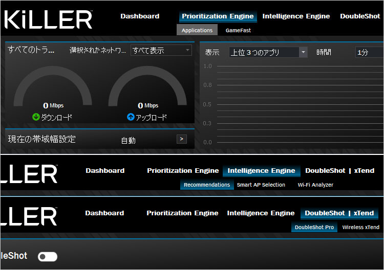 ユーティリティソフトのKiller Control Centerで、ネットワーク接続をモニタリングし、オンラインゲームのパフォーマンスを最大化することができる。KillerでははWindowsが抱えるネットワーク処理の一部を肩代わりする機能を持ち、優先度の設定に基づいてネットワーク帯域幅を最適化、および管理する。CPU負荷を低減させネットワークの遅延を抑えるため、とくにオンラインゲームでは安定した通信が確保できる。
