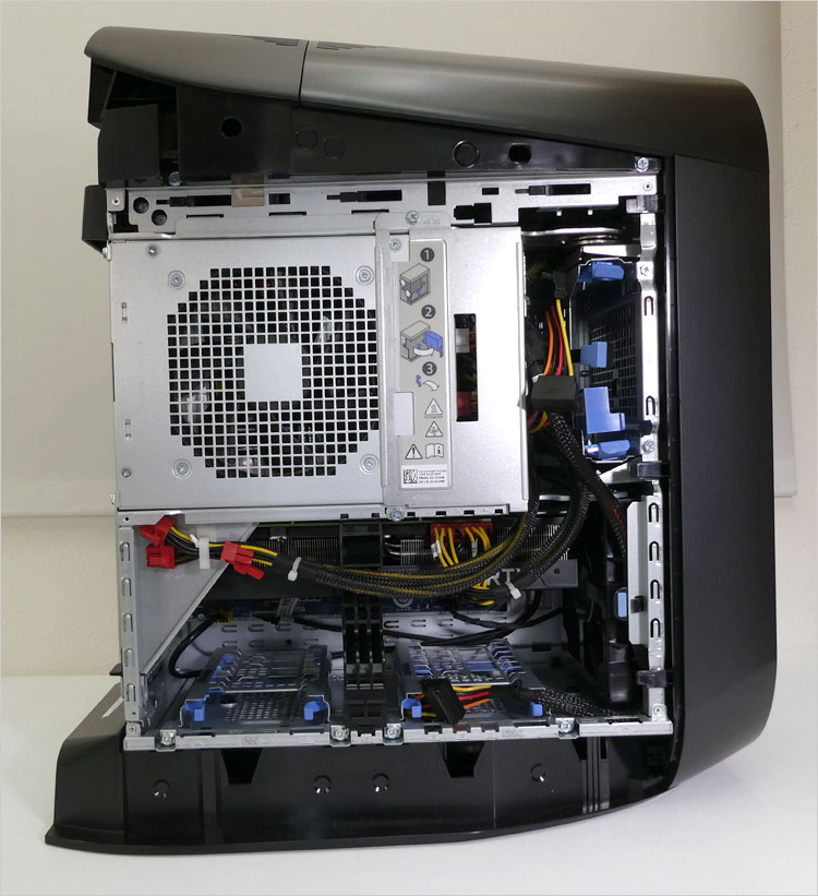 ALIENWARE AURORA-R12は「スイングアーム式」の内部アクセスとなっており、電源ユニットを載せたアームをスイングすることでマザーボードにアクセスできる。なお、ドライブベイへのアクセスでは動かす必要はない。