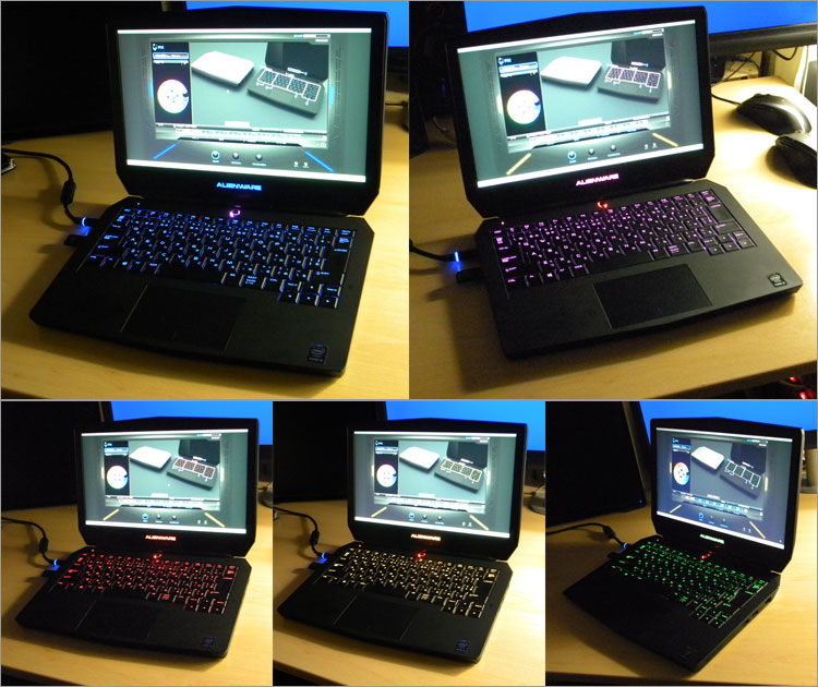 AlienFXではALIENWARE 13の8箇所ある照明ゾーンをユーザーによって設定でき、20色から配色できる。いわゆるイルミネーション装飾。対応ゲームであれば、ライトがムービーに合わせてリアルタイムで反応することもできる。(点滅や1つの色から次の色へとLEDを変化するような反応)。