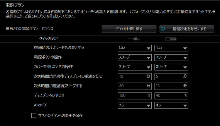 ALIENWARE ロゴと電源ライトも設定できる。