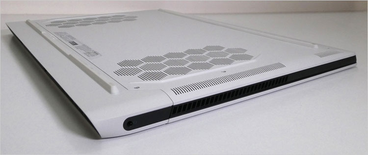 ハニカムデザインのところは吸気口のため、排気熱を吸気しないようエンボス加工の仕切りでブロックされている。ちなみに吸気口は底面だけでなくキーボードの上部にも配置されている。このように薄型ながらもがっつりした冷却システムになっている。