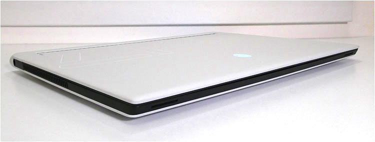 カラーはルナライト(シルバーホワイト)というモデル。イメージとしては乳白色寄りの落ち着いたホワイトという感じ。耐久性クリアコーティングが施してある。DELLサイトでは「シルキースムーズ加工」とも書かれている。左下にはエイリアン語でおそらく「17」と書かれている。