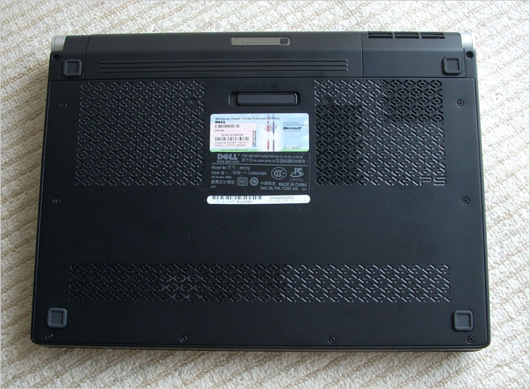 背面には排気口のみ。DELLサイトによると「航空機にヒントを得たフード・排気口を採用」という。マニュアルによると、「壁際に置く際、背面の排気口から10.2センチ以上離してお使いください。」とあります。あとはバッテリー部分で占める。