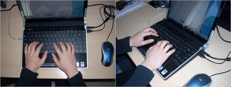 アイソレーションキーボード風ではあるが、やはりちょっと違う。隣接するキーとは完全に隔離しておらず、キーの突起部分だけが隔離している形状。この頃は縁ぎりぎりまでキーボード面積をとっているデザインが多かった。(今は汎用性キーボードパーツの乱用で、両脇のスペースが余っているケースが多い。)。パームレストが光沢ブラックなので、指紋が付きやすく目立つ。