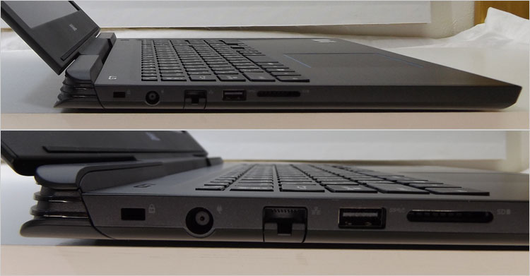 G7-7588の左側面に、セキュリティロック・スロット、電源コネクタ、ギガビットイーサネットLAN端子、USB3.1-Gen1(PowerShare対応)、SDカードスロットを配置。