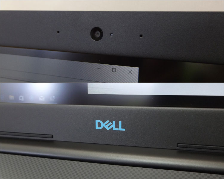 ディスプレイベゼルにWebカメラ、デュアルマイク内蔵、そして水色のDELLロゴプリント。