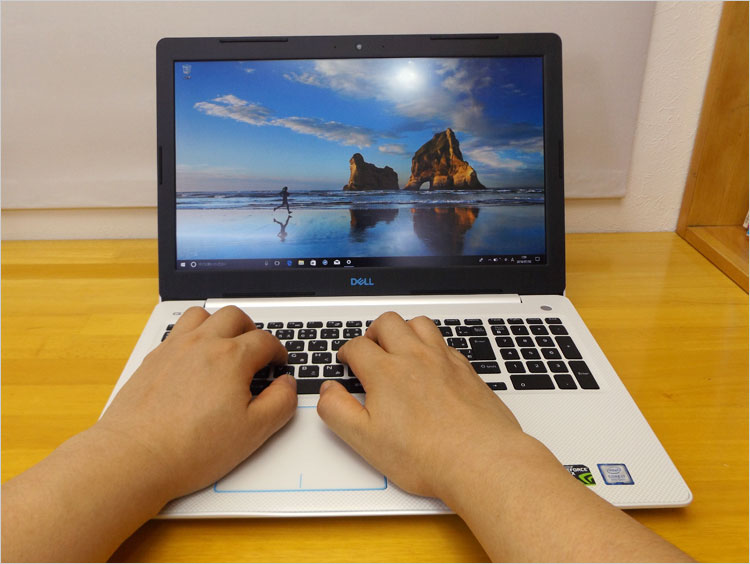 G3-3579(ホワイト)のパームレストとキーボード。ここで使われているキーボードは、DELLの他モデルでも多々採用されている。G7-15(7588)などで採用されているテンキー付きキーボードのページを参考に。