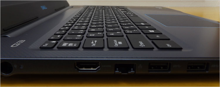 光学ドライブはないが、23mmの厚みなので結構薄型のスタイリッシュ・デザイン。これでゲーム入門機レベルのパフォーマンスなんだからありがたい。