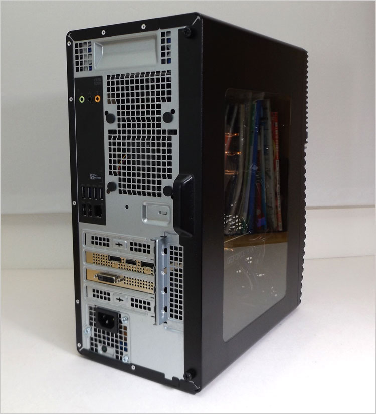このG5-5090レビュー実機ではオプションの「スケルトン窓」仕様になっている。DELLサイトでは「透明なサイド ドア」または「クリアサイドパネル」と呼んでいる。
