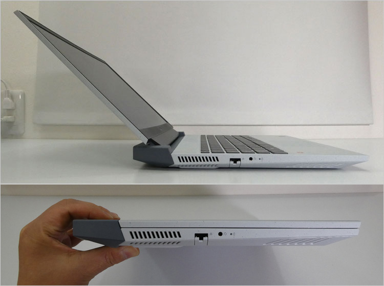 ヒンジ(蝶番)の配置を前方式にした「ヒンジフォワード」を採用。これは後部に大型の冷却ユニットを内蔵できる構造である。ディスプレイ開閉角度の影響を受けず、背面排気口の妨げにならない。