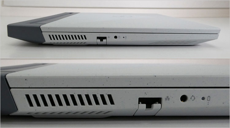 左側面では、ギガビットイーサーLAN端子、ヘッドセット端子、バッテリーライトを配置。LAN端子は開口するギミックになっている。