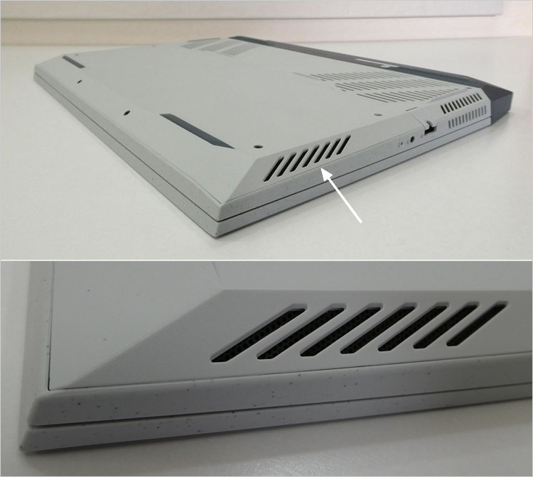 底面。デュアルファン内蔵のため、大きく開いたスリットの吸気口が確認できる。