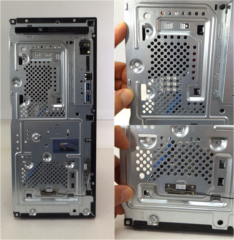 フロントパネルを外した様子。一番下に無線LANカードのアンテナ線が配置されている。