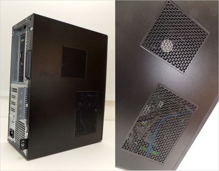 左サイドパネルでは、通気口が2箇所。上部のスリットはCPUクーラーの排気用。(吸い出し式空冷でパッシブダクトを通って排気される)。