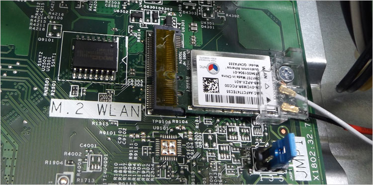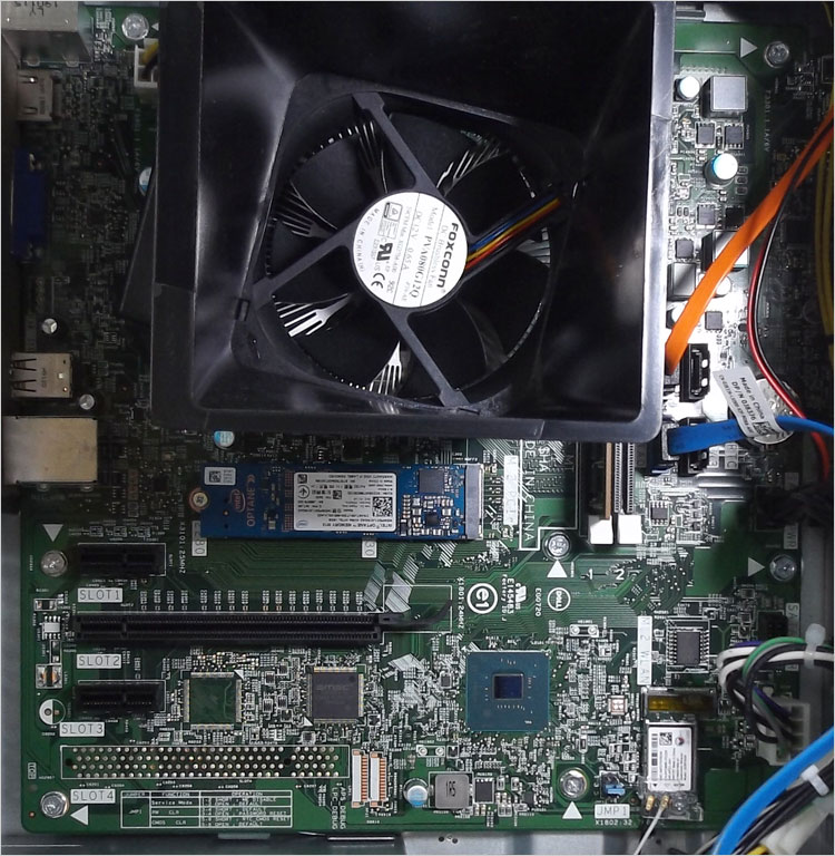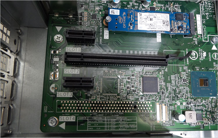 M.2スロット。この実機ではOPTANEメモリーを搭載しているが、NVMe SSDを搭載するのにも使う。Type2280とType2230のフォームファクタに対応しており、受けネジの位置を変えればどちらかが使える。スロット側の印字では「M.2 PCIe」とあるのでSATA SSDは使えないと思われる。