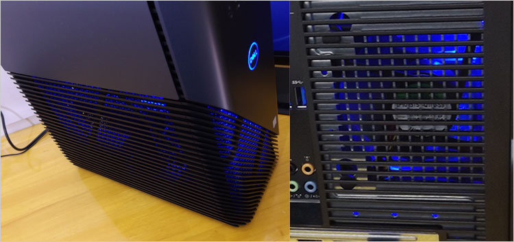 光が反映されるのは、左側面スリット、前面のDELLロゴ、背面の排気ファン。
