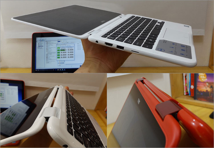 ディスプレイを背後に折り曲げることで、ノートブックモード、タブレットモード、スタンドモード、テントモードの4形態にできる。ヒンジの稼働は安定しており、気になる脆さはない。