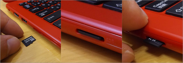 micro SDカードを挿入する様子。割りと奥まで挿入されるので、入れたままでも邪魔にならない。32GB eMMC搭載で購入した場合は、ストレージ容量を補うのに重宝できるだろう。取り出すときは一旦押し込んで突き出したところを取り出す。