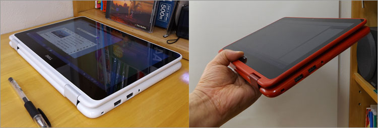 レッドモデルのノートブックモード。赤と黒のツートンカラー。