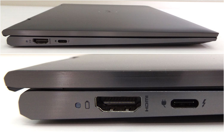 Inspiron 13(7306)2-in-1が装備する端子をチェック。左側面では、電源ライトおよびバッテリーライト、HDMI端子、USB Type-C端子(Thunderbolt 4)を配置。