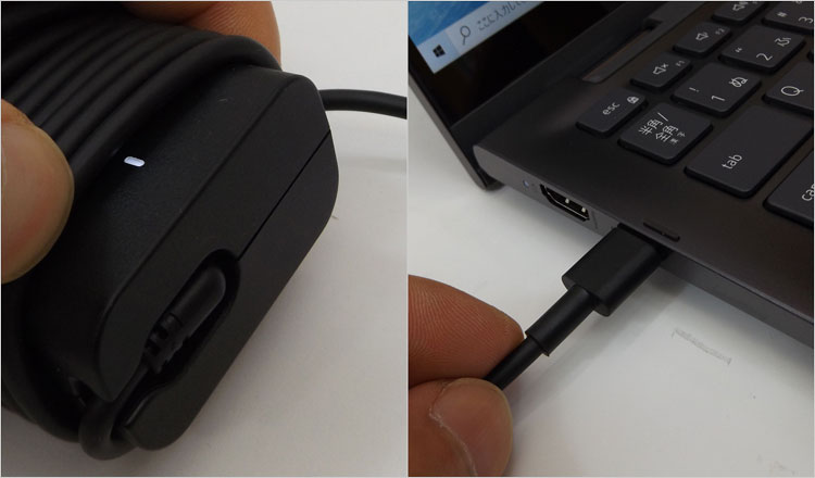 付属していたのは、65W ACアダプタでType-Cコネクタを使用している。Power Delivery対応機であれば、ほかのPCにも流用できるメリットがある。ただ給電中はType-C端子が使えなくなるデメリットがある。