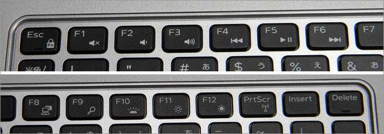 F10と兼用でバックライトキーボードの切り替えスイッチがある。オンオフだけでなく2段階の調光が可能。(写真では調光具合が分かりにくいが、実物では若干の差が分かる)