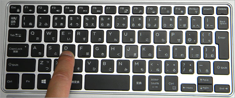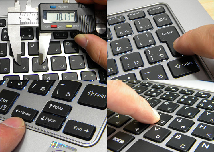 半角全角キー、~、¥キーなどが若干小さくなっているが、多くは約18mmキーピッチのフルサイズキー。