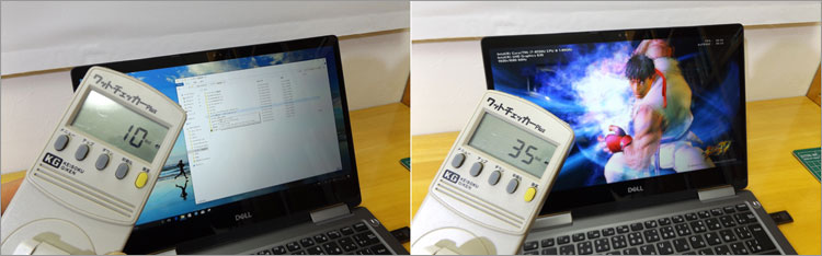 消費電力ではアイドル時で10Wあたり。ストリートファイター4ベンチマークテストでは35~40Wあたり、CINEBENCH R15では34Wあたり。いずれも満充電、ディスプレイ輝度最大、むろんACアダプタ接続時である。