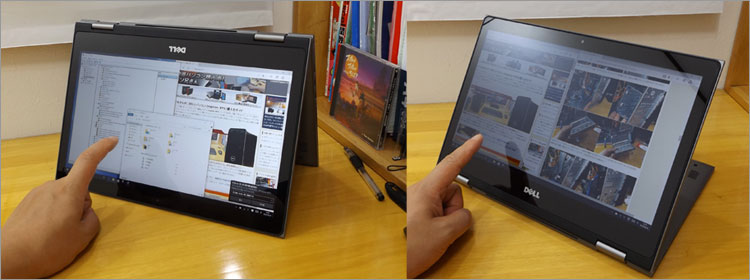 ディスプレイが回転する機構を利用して、テントモードや、スタンドモードで利用できる。テントモードは接地面積が少なくて済むので、何か作業スペースを確保しながらパソコンを使う場合に活躍できる。