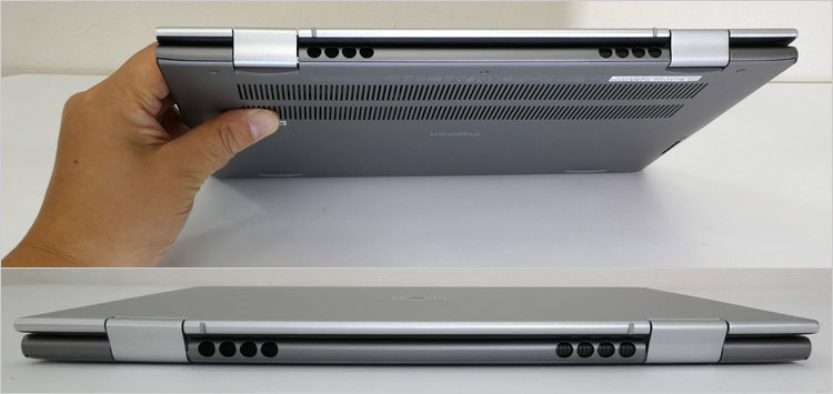 排気口は4つのホール状デザインになっており、左側に配置されているのは空冷ファン直結で放熱フィンを覗かせている。右側に配置されているのはダミーデザインのため、通気口としての機能は無いようだ。つまり、シングルファンの内蔵となっている。なお、後述の「リフト・ヒンジ構造」のため、角にゴムスタンドが取り付けられている。