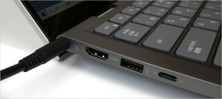 市販されているType-Cの電源アダプタがあれば、USB Type-C端子での給電も可能になる。容量は65W以上が必要となるが、65W未満だと充電に時間がかかるなどのパフォーマンス低下につながる。