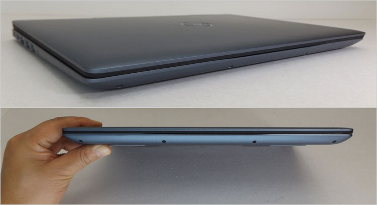 寸法は幅: 328 mm × 奥行き: 233 mm × 厚み: 20 mm 。 DELL公称重量は約1.67kgだが、レビュー実機の測量では1.755kgだった。