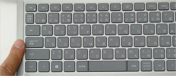 左サイドのキー(tab、caps lock、shift)は横長で面積広め。特に使用頻度の高い半角全角キーが少々小さい。しかし最も左端に位置するため、誤接触はほぼない。