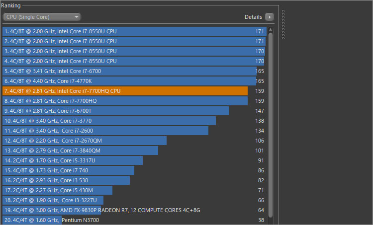 シングル・スレッドでのパフォーマンスは、スコア159。ちょっと目移りするのが8世代Core i7-8550Uの存在。スコア「171」をマークしており「Uシリーズの分際で!」と物申したくなるほどに高性能化。Core i7-7700HQではシングルスレッドで少し負けているが、先述のマルチスレッドでは差をつけているので、ここは安堵しておくか。
