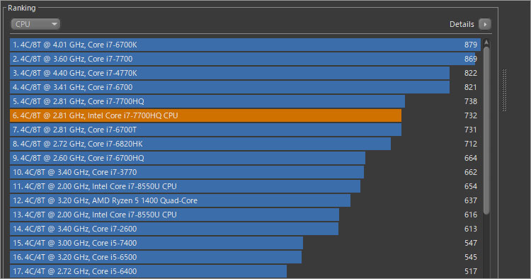 このInspiron 15(7577)ゲーミングに搭載しているCore i7-7700HQではスコアが「732」。他のPCでも近いスコアだったので適正値と判断して良さそうだ。