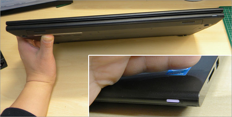 背面のヒンジ。ディスプレイはあまり開く方ではないが、通常使用では問題ない。(写真参照)