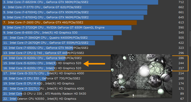 CPUを最大稼働するレンダリングのCINEBENCH R15ベンチマークテスト。スコアは、244cbだった。過去の蓄積データを見ると、同じCore i5-6200Uを搭載していても単体GPUを搭載していると伸びがよい。また、Core i7-6500Uだともうちょっと伸びるようだが、いずれにしてもUシリーズと内蔵グラフィックでは、本格的なゲームやエンコード作業には向いていない。ネット、ビジネスソフト、2D高精細コンテンツ向けのパフォーマンスである。