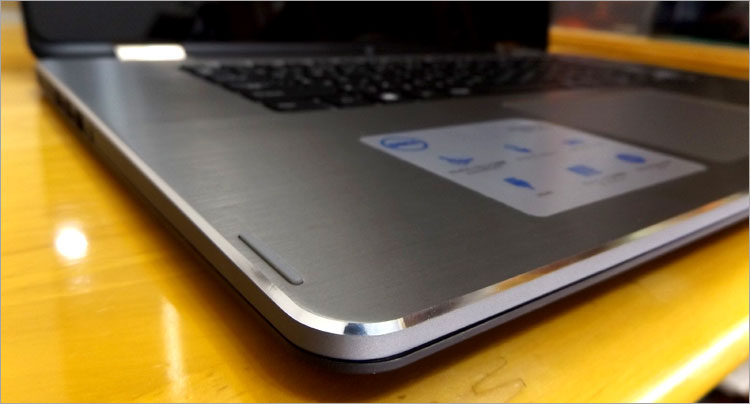 重厚感と高級感のあるパームレストではアルミ素材を採用しており、ダークシルバー系のカラー。そしてヘアライン加工がされている。気になったのが、キーボード・パーツが13.3インチモバイルで採用されるものっぽい。Inspiron 15 7000シリーズ(7568)のパームレスト面積に対して、中央に寄ってしまっているアンバランス感が否めない。15.6インチノートとして据え置き用途がメインになると思うが、操作性に関してはモバイルノートと同じである。タッチパッドエリアは結構広い。