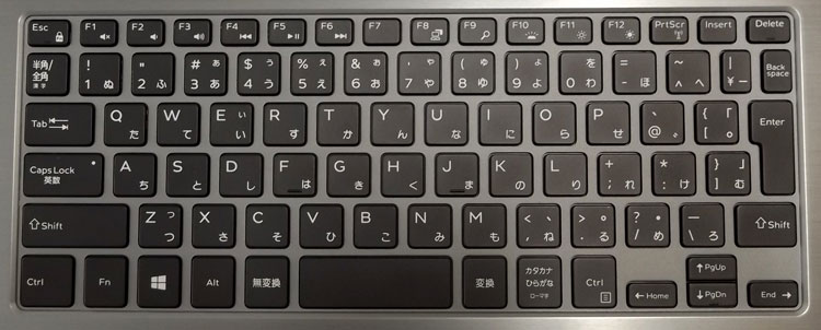 Inspiron 15 7000シリーズ(7568)のキー配列。みたところ、XPS 15(9550)と同じキーボードパーツである。XPS 13(9350)とは半角全角キー、「へ」や「ほ」のキーで微妙に違う。